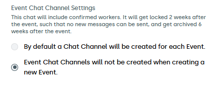 → An Event Chat will be automatically created for all confirmed workers and coordinators.Option 2: Event Chat Channels will not be created when creating a new Event